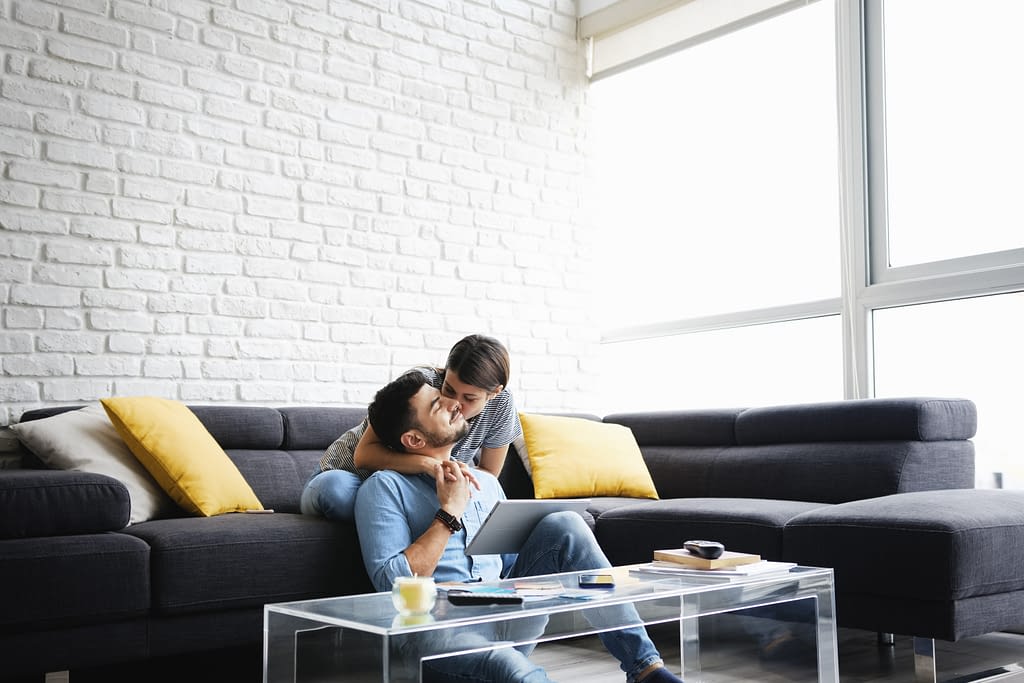 Young hispanic couple sitting on sofa at home, using a tablet PC for Internet and social media. The girl is hugging her boyfriend and smiles at camera. Copy space